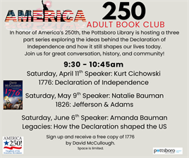 In honor of America’s 250th, the Pottsboro Library is hosting a three part series exploring the ideas behind the Declaration of Independence and how it still shapes our lives today. Join us for great conversation, history, and community! Speaker: Amanda Bauman Legacies: How the Declaration shaped the US. Participants must sign up for each session.