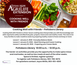 Cooking Well with Friends is a three-lesson cooking class that provides you with the knowledge and skills required to safely and effectively plan, prepare, freeze and cook healthy meals. This class is for individuals or busy families to make mealtime easier by preparing healthy meals to freeze and keep on hand. This is a three part series. Attendees need to sign up for each date.