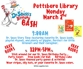 Join from 12-5pm for our Dr. Seuss Birthday Party... We will have party favors, free books for kids, birthday cake and Dr. Seuss themed party games & activities. Wear stripes, silly hats, or your favorite Dr. Seuss colors. Whiles supplies last.Dr. Seuss Story Time and Birthday Bas...Date and Time
