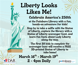 Celebrate America’s 250th at the Pottsboro Library with a fun, hands-on adventure for kids! Stop by to take a selfie with the Statue of Liberty, explore the library with a Statue of Liberty scavenger hunt, and learn fun facts about Lady Liberty along the way. The first 20 kids to complete the scavenger hunt will receive a FREE 3D-printed Statue of Liberty to take home! No sign ups needed, the event runs all week.