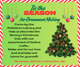 Come by the Pottsboro Library and help us decorate the library’s Christmas tree with our assortment of festive crafts... Make one for our tree and and take one home for yourself! November 23rd thru December 4th. No sign up needed.