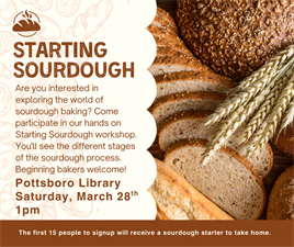 Are you interested in exploring the world of sourdough baking? Come participate in our hands on Starting Sourdough workshop. You'll see the different stages of the sourdough process. Beginning bakers welcome! The first 15 people to signup will receive a sourdough starter to take home.